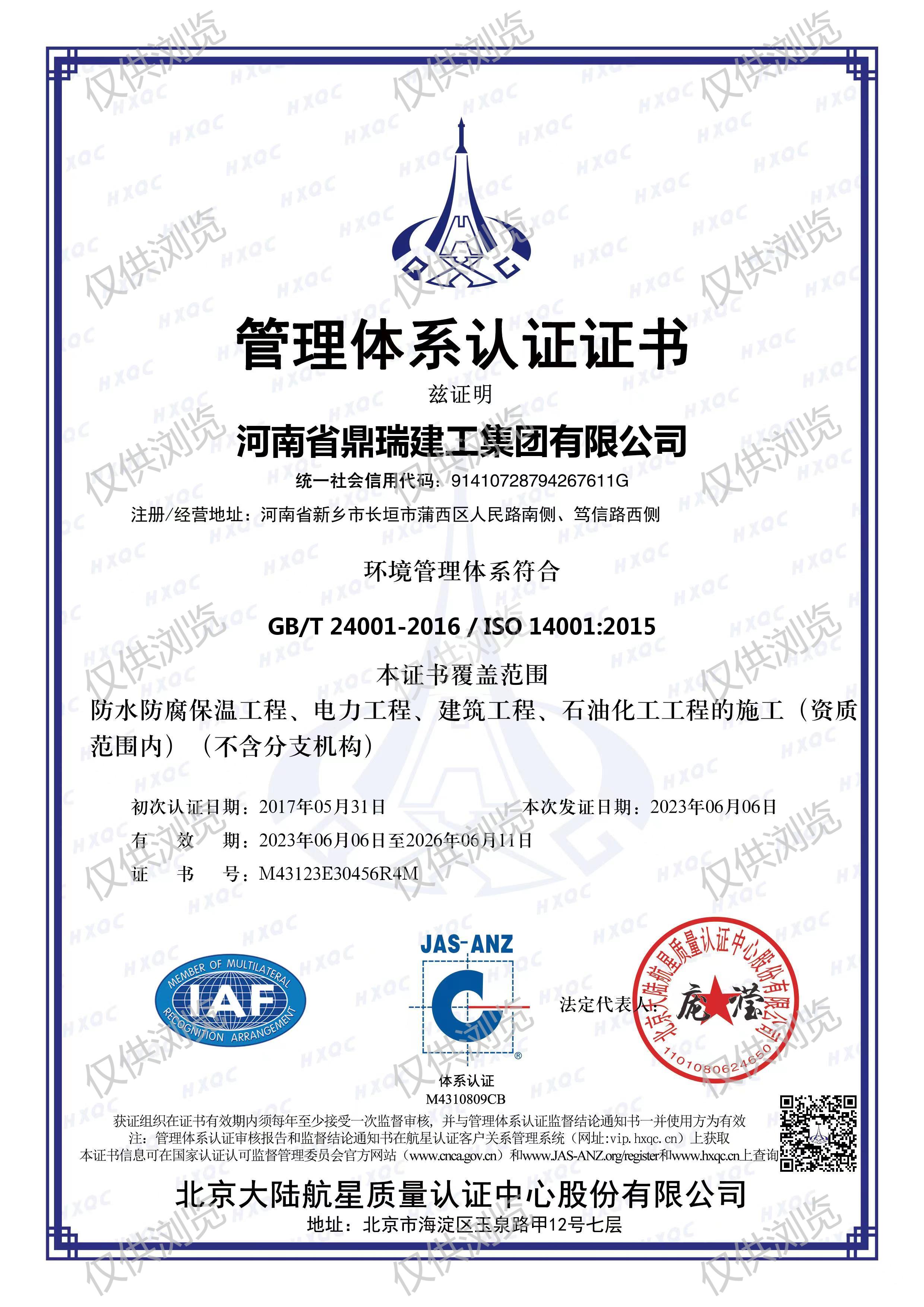 環(huán)境管理體系認證證書